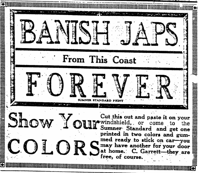 The newspaper also circulated a free poster that said, “Banish Japs from this coast forever,” and encouraged people to “show your colors” by pasting one on their windshields.