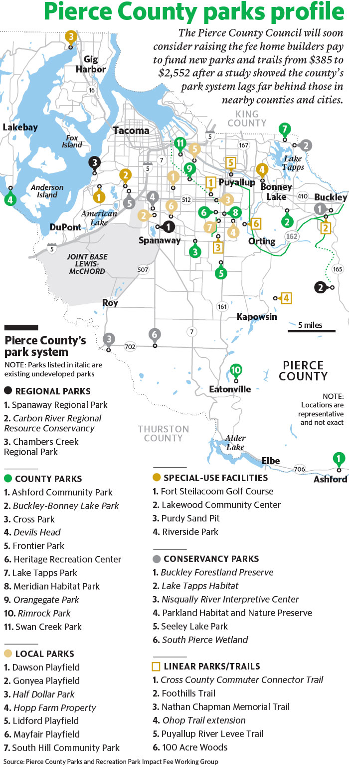 Pierce County is at the bottom of the list of Puget Sound-area counties and cities in the amount of park impact fees per dwelling it levies to finance new parks and trails and to improve existing parks.
